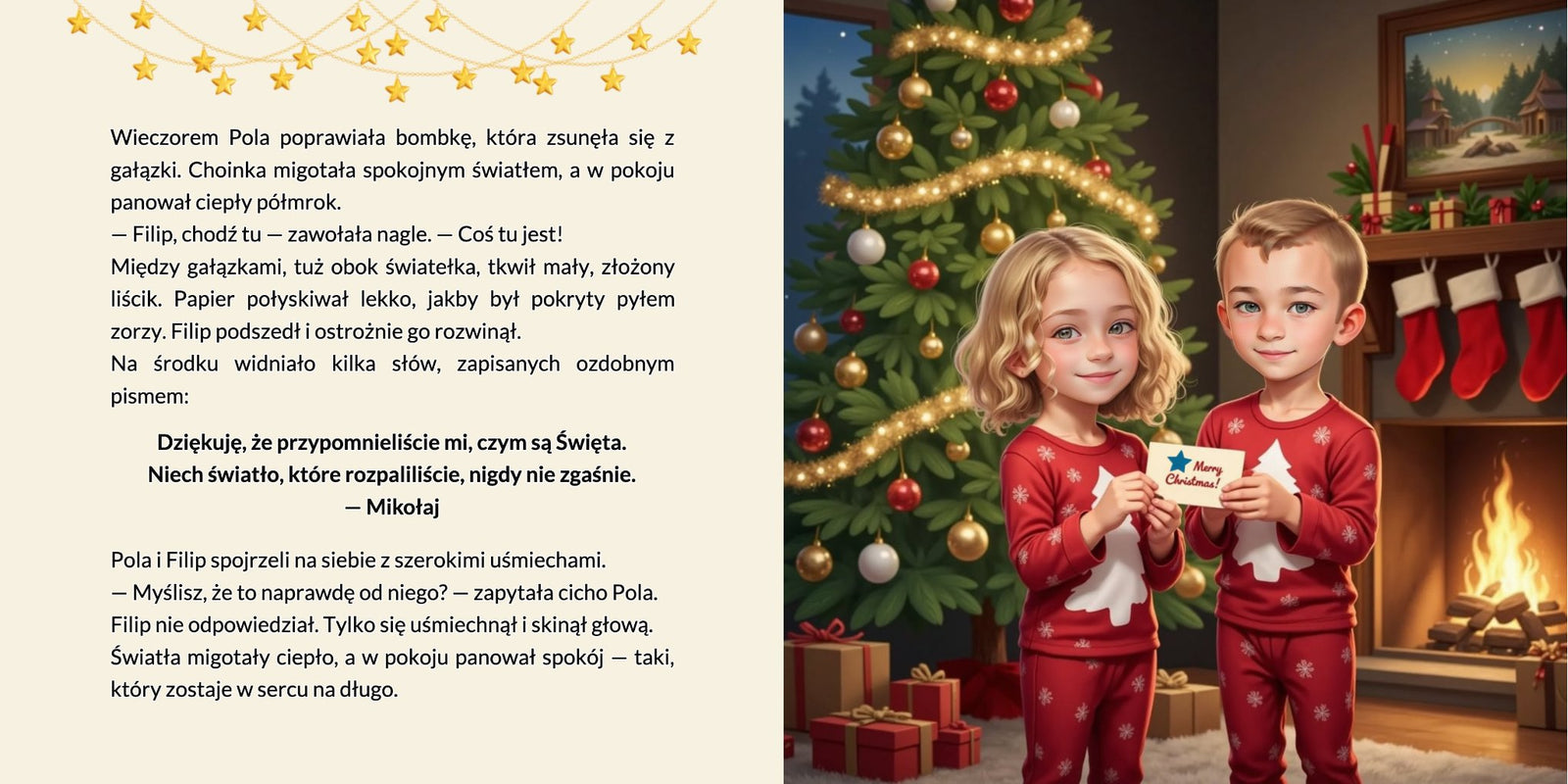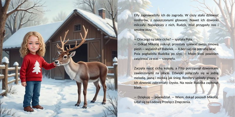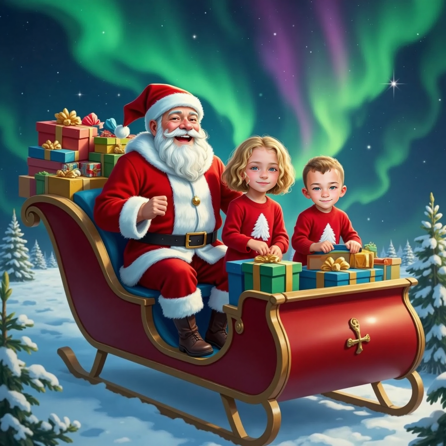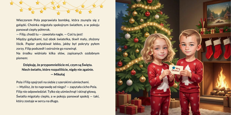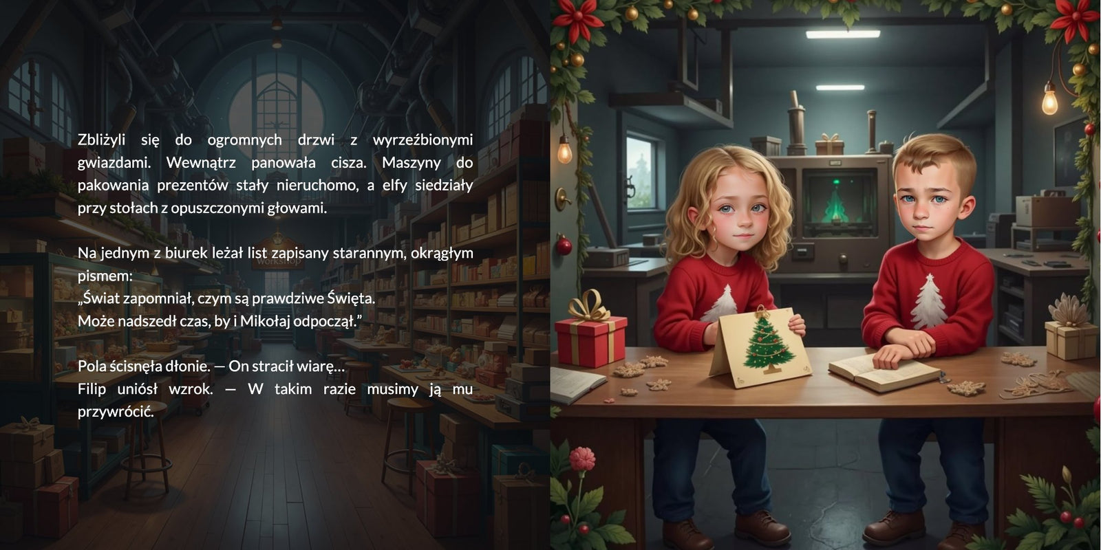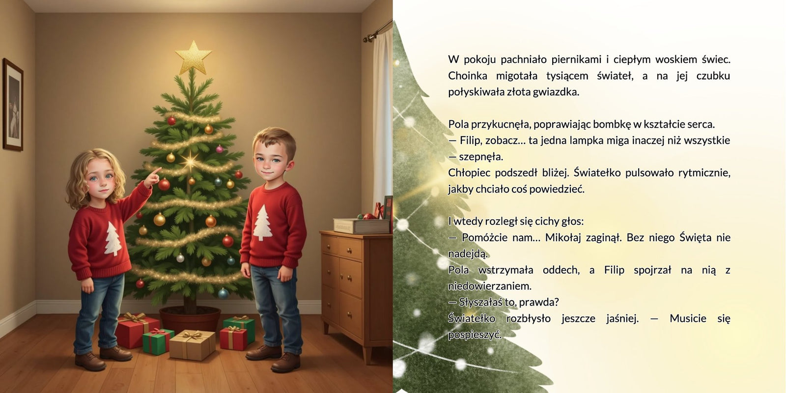 Upload photos of two children and take them into a magical Christmas land! They will discover a mysterious light on the Christmas tree that transports them to a world where Santa has gone missing. Elves and reindeer will ask for their help in restoring the magic of Christmas. An unforgettable adventure full of courage, teamwork, and the warmth of the festive season awaits them!